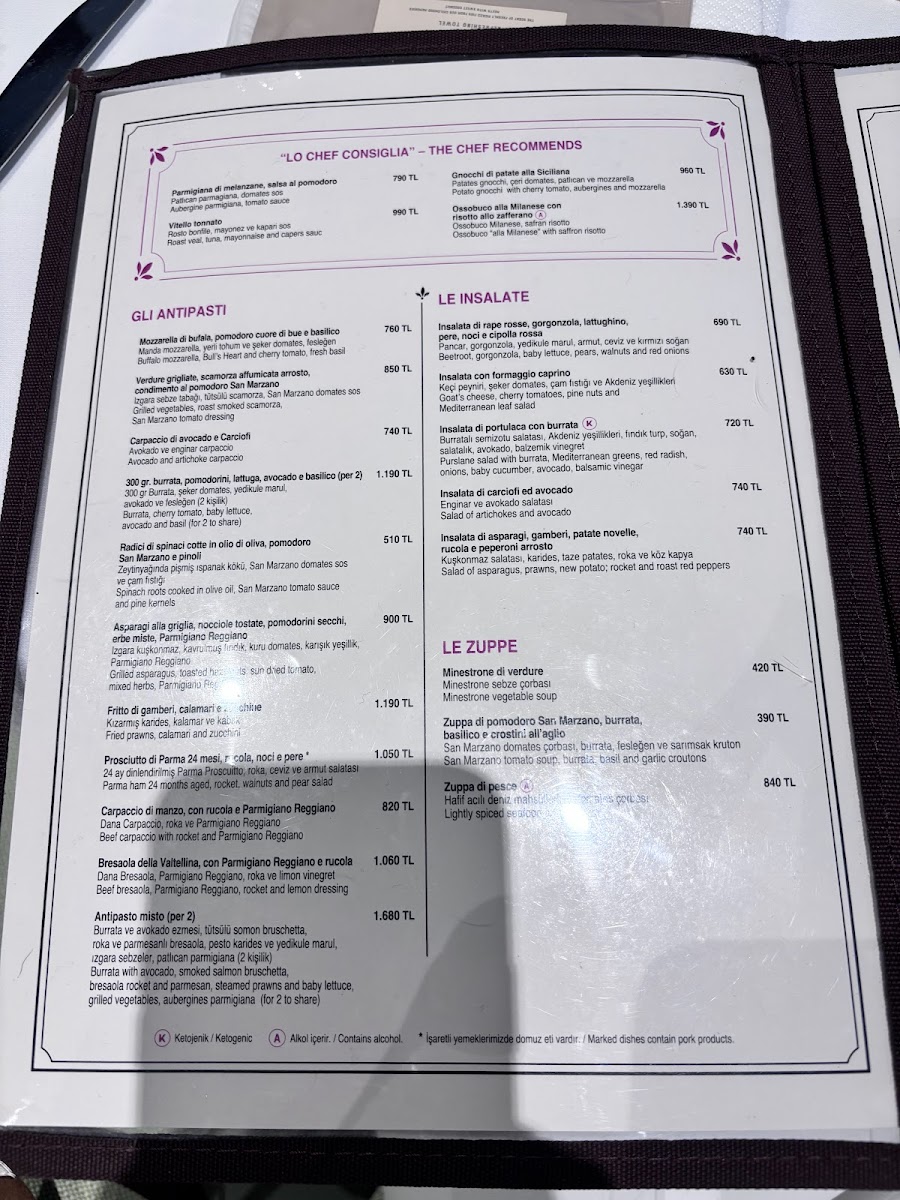 San Marzano domates çorbası, burrata, fesleğen ve sarımsak kruton San Marzano tomato soup, burrata, basil and garlic croutons