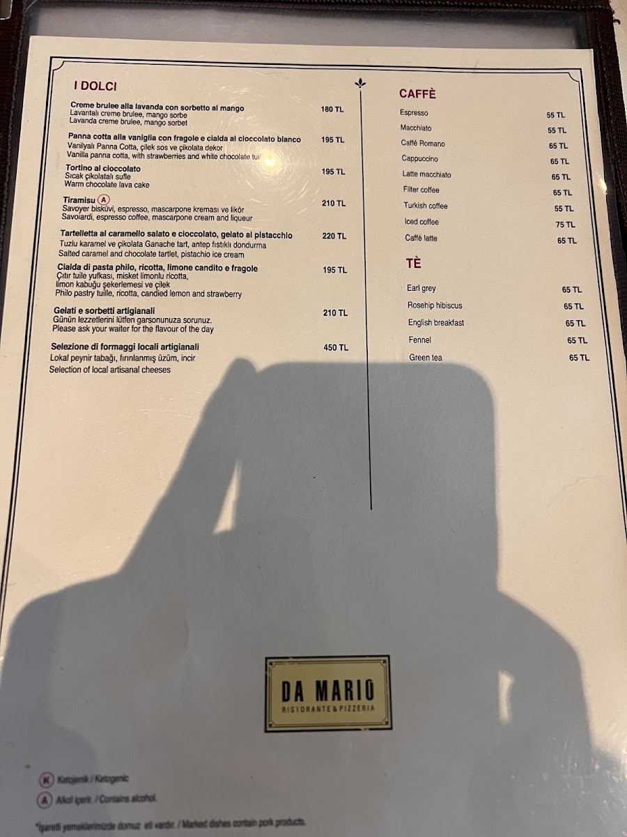 Da Mario Ristorante & Pizzeria offers a sophisticated yet approachable menu, combining traditional Italian flavors with refined ingredients. The "Lo Chef Consiglia" section showcases a variety of delectable dishes like the hearty Parmigiana di melanzane, the flavorful Polipo alla griglia, and the indulgent Costolette di agnello a scottadito. For appetizers, the Treccia di mozzarella di bufala with pomodoro cuore di bue and basilico, as well as the Carpaccio di avocado e Carciofi, promise fresh and vibrant tastes. The salads, such as the Insalata di rape rosse with gorgonzola, noci, and pere, offer a light, refreshing start. The soup selection includes comforting choices like Minestrone di verdure and a tangy Zuppa di pomodoro San Marzano with burrata. For pasta lovers, there's a range of options, including Linguine asparagi e tartufo and the indulgent Ravioli di porcini e mascarpone al tartufo nero. Seafood dishes like Salmone alla griglia and Filetto di orata alla griglia are perfectly complemented by sides like fagiolini piattoni al pomodoro. The pizza selection, featuring classics like Margherita and indulgent Pizza burrata olio tartufato, offers something for every palate. To end the meal, desserts such as Crème brulé alla lavanda with sorbetto al mango or the rich Tiramisú are perfect choices. Completing the experience, the café menu offers a selection of coffee and tea, from Turkish coffee to Earl Grey tea. Da Mario delivers a delightful array of authentic Italian dishes, making it an excellent choice for any occasion.